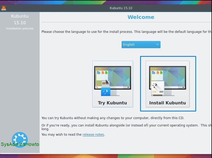 14. Click Install Kubuntu at Kubuntu 15.10 welcome screen.