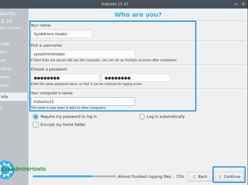 20. Write your full name, pick a username, set your password and set hostname for Kubuntu 15.10 and then click Continue to begin the installation.