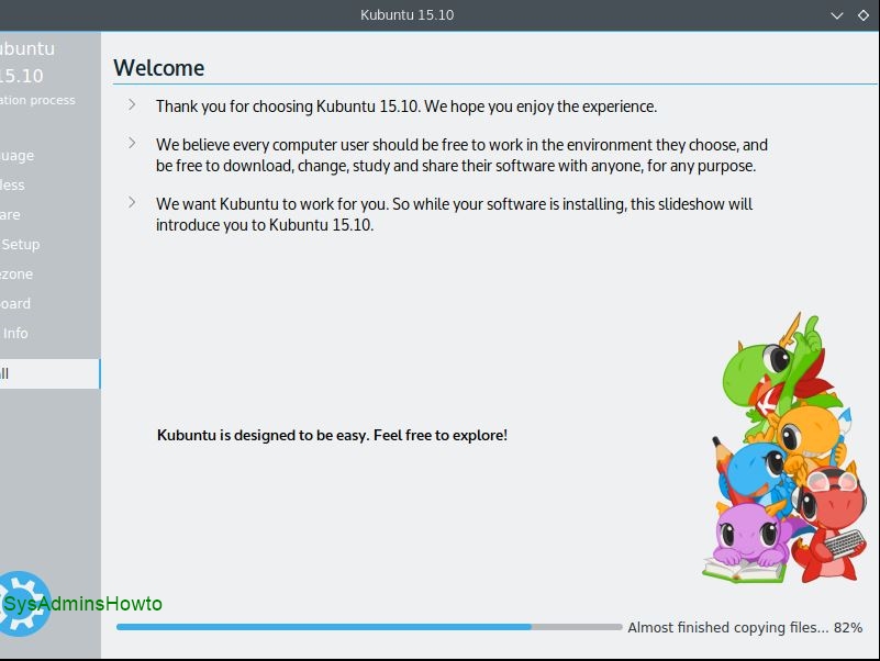 21. Kubuntu 15.10 (Wily Werewolf) installation process takes approximately 5-10 minutes.