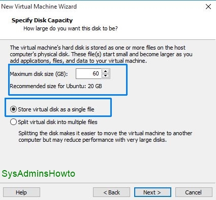 7. Specify how much disk space you want to use for Ubuntu VM. I set it as 60 GB. I also select Store virtual disk as a single file option. This option gives more performance to kubuntu virtual machine.
