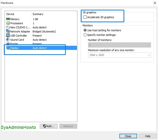 11. Go to Display and un-check Accelerate 3D graphics then click Close.